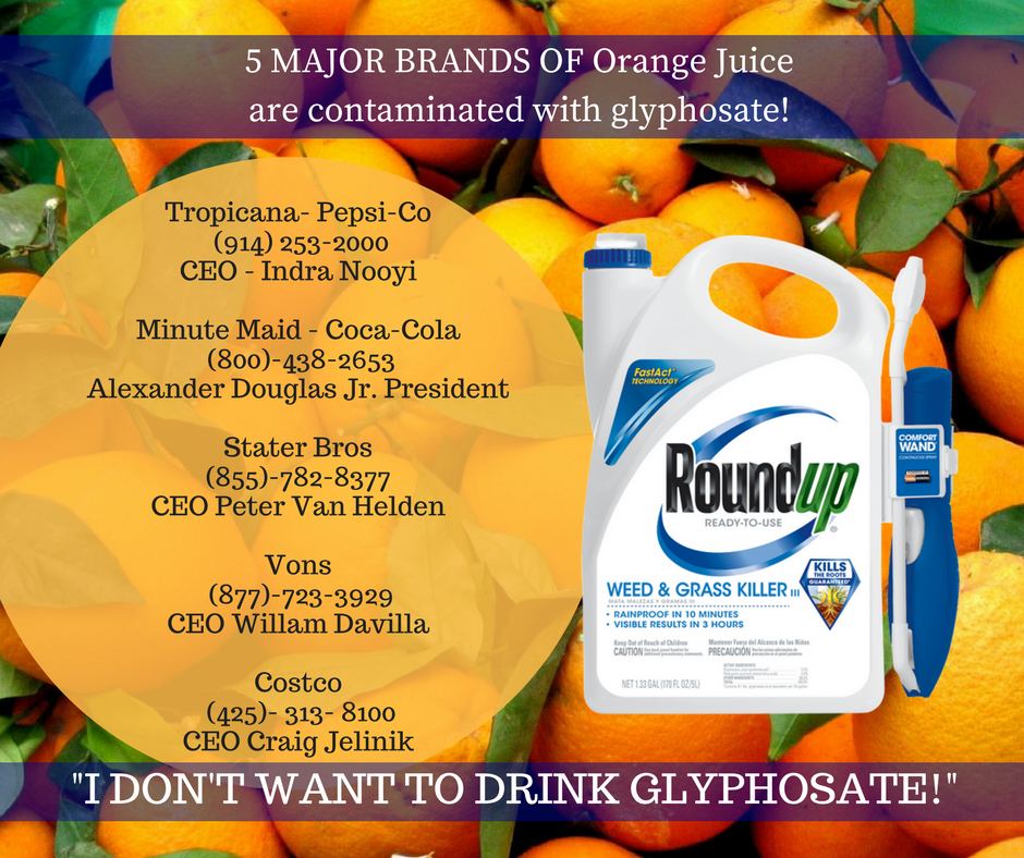 Detail reports and other important information about the glyphosate testing results can be found at http://www.momsacrossamerica.com/all_top_5_orange_juice_brands_positive_for_weedkiller.