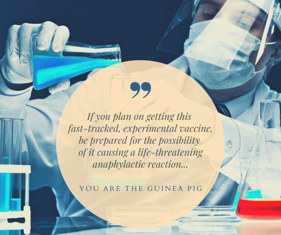 Remember, it is possible to have an anaphylactic reaction to the following without ever having any allergies in the past as the woman in Britain did. Of course, if you do have a serious reaction, there is no liability for anyone who made or administered the vaccine.