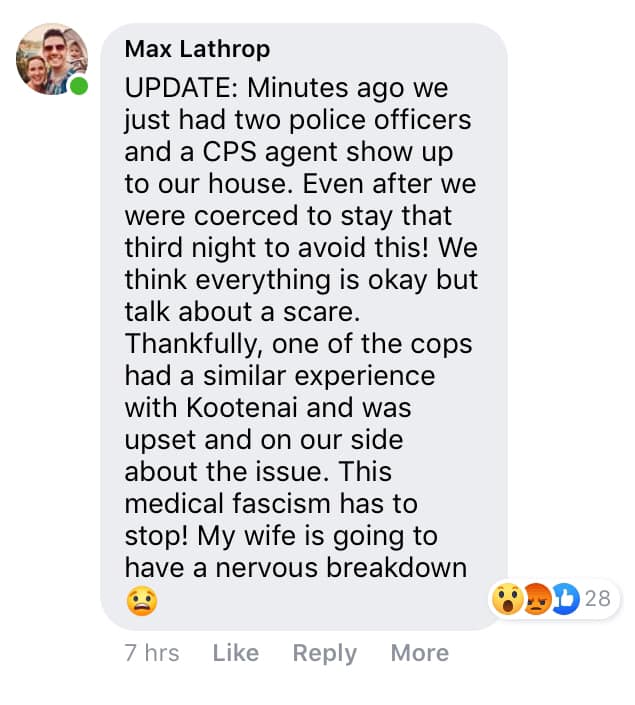 “When Max Lathrop left a scathing review on the Kootenai Health page friends brought it to my attention. I reached out to Max and he agreed to an interview. Max is a dad who wants his family’s story to be told in hopes that it will prompt change and spare other families from the undo stress of needless threats that CPS will be called if you don’t comply with the hospital’s recommendations. Why is Kootenai Health against parents making medical decisions? My takeaway from his story is that Kootenai Health must stop using the threat of CPS to force tests, treatments, or extra nights stay at the hospital. It may appear that Kootenai Health is using CPS to increase funding.” – Miste Karlfeldt, Health Freedom Idaho Executive Director