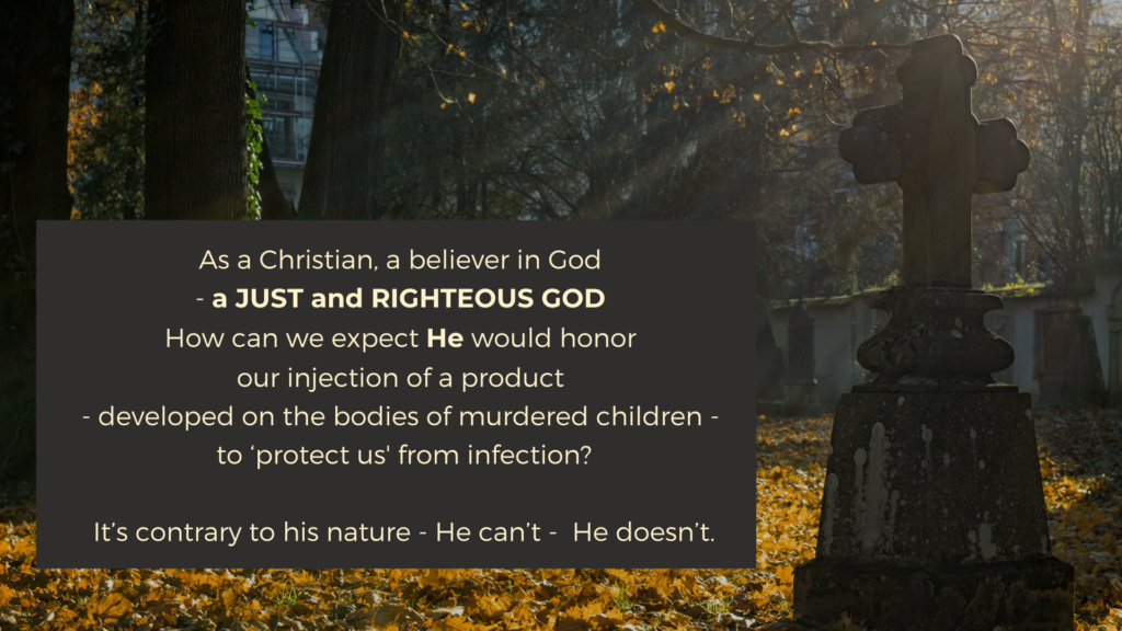 As a Christian, a believer in God – a JUST and RIGHTEOUS GOD How can we expect He would honor our injection of a product – developed on the bodies of murdered children – to ‘protect us from infection?