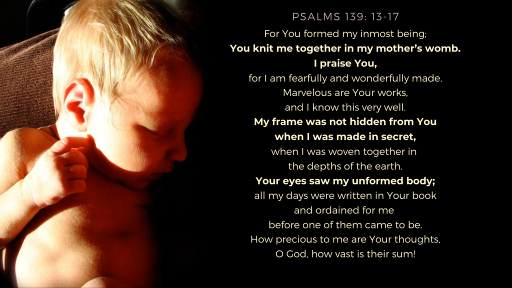 As a pro-life Christian, I believe that human beings are created by God in His image. Therefore every person, from conception to natural death, possesses inherent dignity and immeasurable worth – including preborn children. As a Christian, then, I am called to defend, protect, and value all human life.