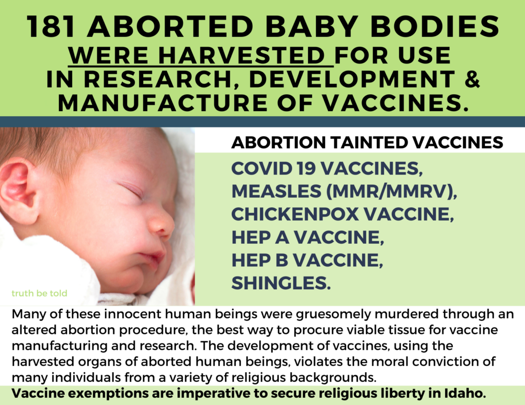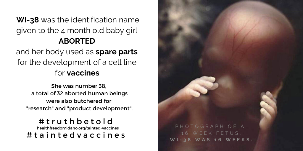 Our children’s vaccines, the Measles, Mumps, Rubella and Chicken Pox are developed on aborted human beings and contain the DNA of those babies.