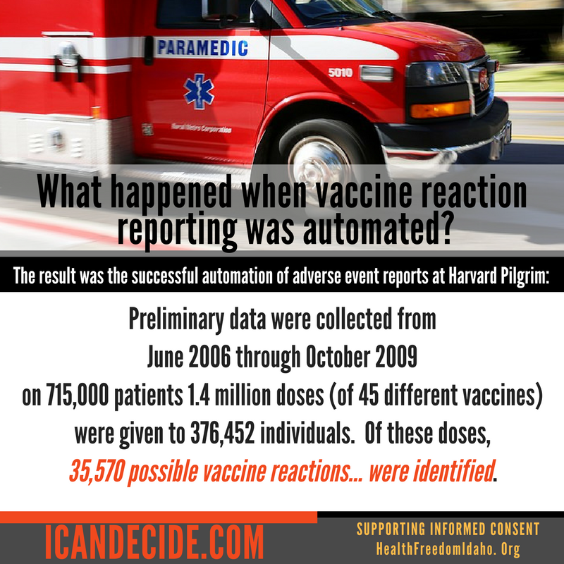The Agency for Healthcare Research and Quality, an agency within HHS, sought to do exactly that in 2007 when it provided an approximately $1 million grant to automate VAERS reporting at Harvard Pilgrim Health Care.33 The result was the successful automation of adverse event reports at Harvard Pilgrim: Preliminary data were collected from June 2006 through October 2009 on 715,000 patients, and 1.4 million doses (of 45 different vaccines) were given to 376,452 individuals. Of these doses, 35,570 possible reactions