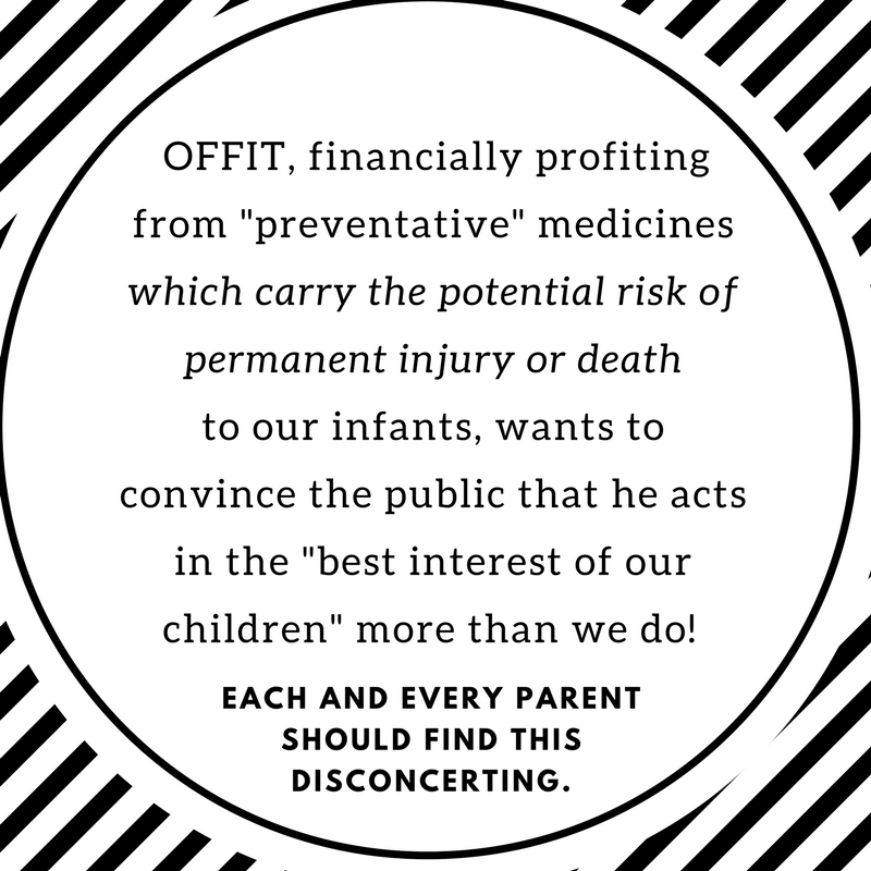 A doctor, financially profiting from “preventative” medicines which carry the potential risk of permanent injury or death to our infants, wants to convince the public that he acts in the “best interest of our children” more than we do!