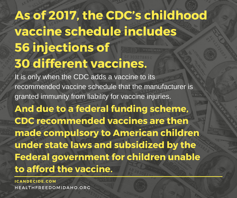 And due to a federal funding scheme, CDC recommended vaccines are then made compulsory to American children under state laws and subsidized by the Federal government for children unable to afford the vaccine.13