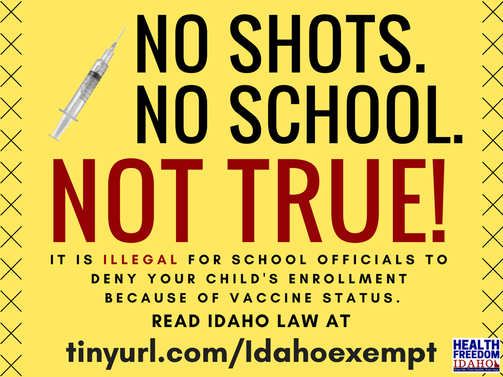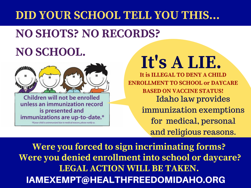 Did your school tell you “no shots – no school?” They are lying! In Idaho, it is illegal to deny your child entrance to school based on the vaccination status.