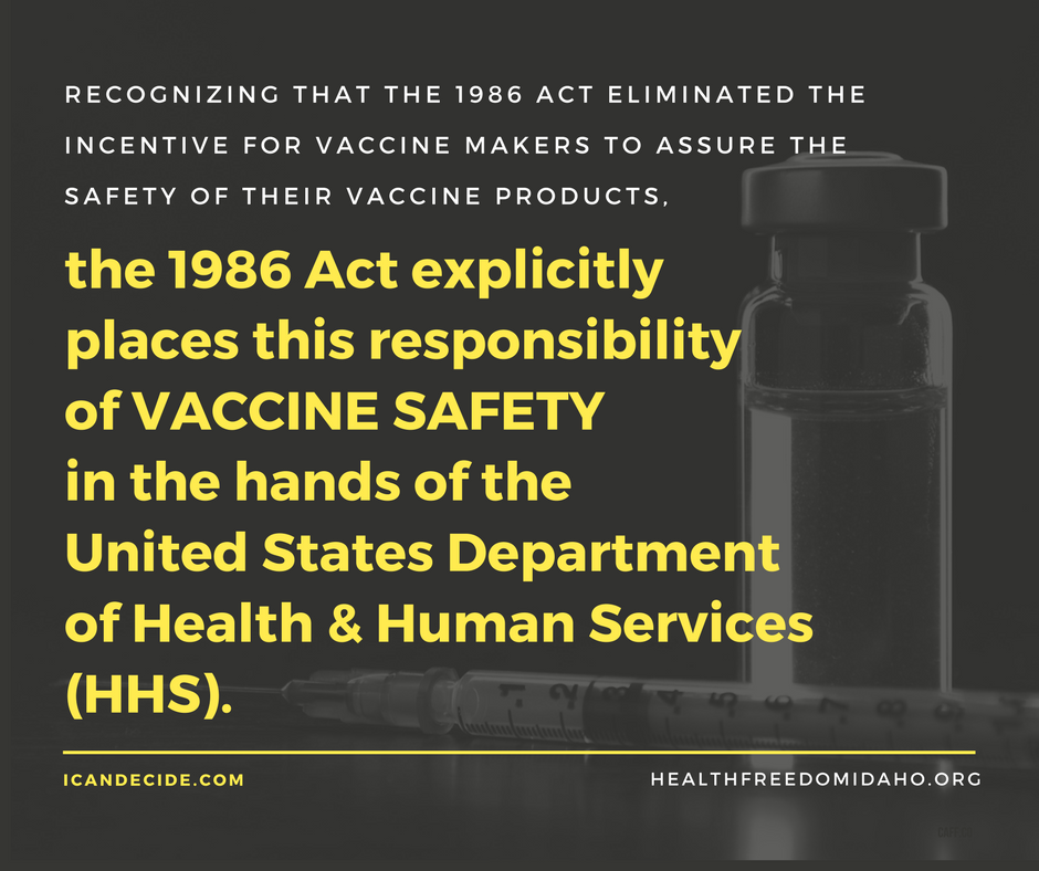 Recognizing that the 1986 Act eliminated the incentive for vaccine makers to assure the safety of their vaccine products, the 1986 Act explicitly places this responsibility in the hands of the United States Department of Health & Human Services (HHS).8