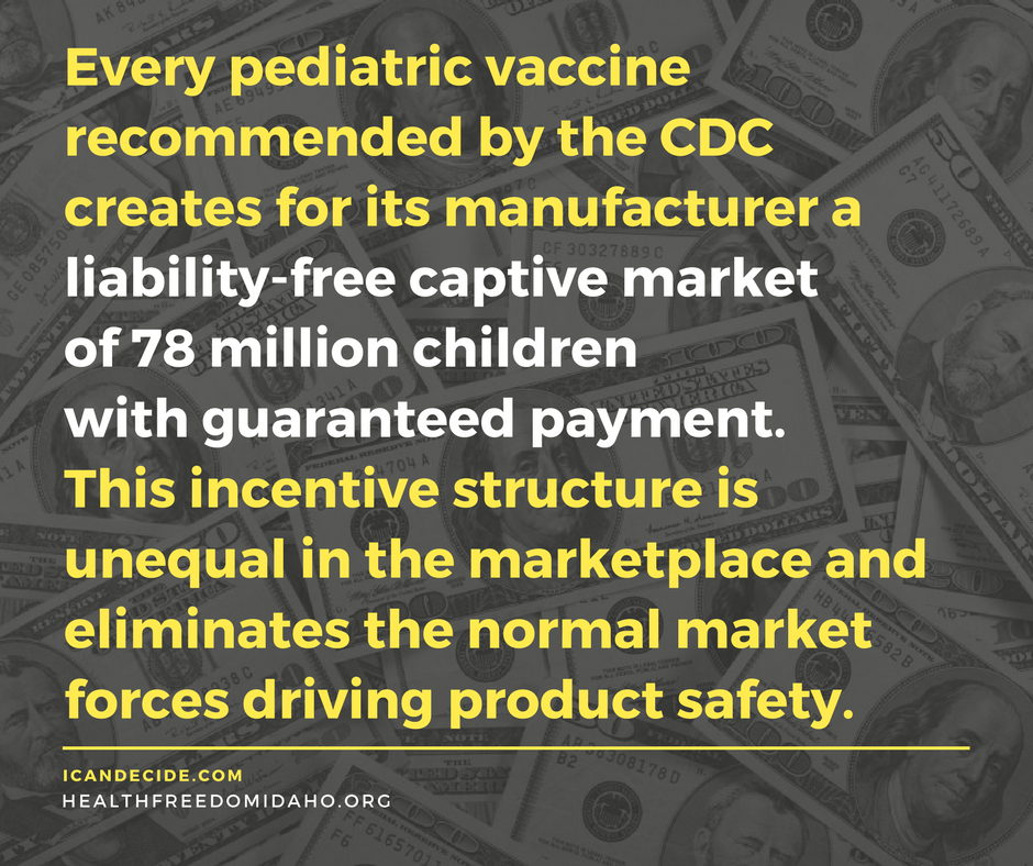 By granting immunity from actual or potential liability from injuries caused by vaccines, Congress eliminated the market forces that are generally relied upon to assure the safety of all other products. As the 1986 Act expressly provides: “No person may bring a civil action … against a vaccine administrator or manufacturer in a State or Federal court for damages arising from a vaccine-related injury or death.” Every pediatric vaccine recommended by the CDC creates for its manufacturer a liability-free captive market of 78 million children with guaranteed payment. So, who is there making sure vaccines are SAFE since manufacturers have no financial incentive do to so.